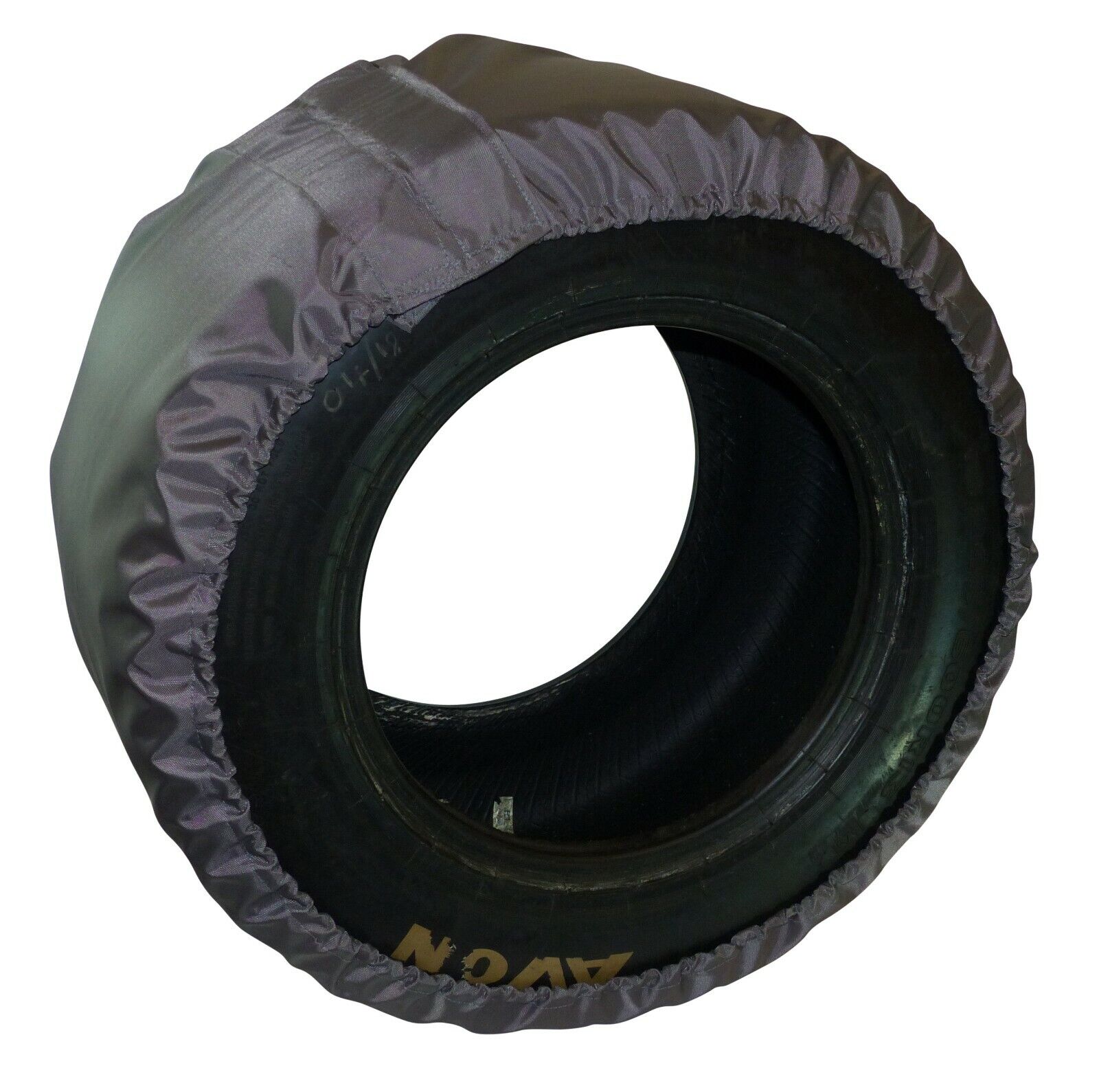 Many hill climb drivers use baler plastic to cover their slick tyres whilst driving from the prep area to the racing circuit. This often involves driving over damp grass which may affect the performance of the tyre. With rising pressure to limit the use of single-use plastics we have developed a waterproof cover for this purpose. The cover is secured with hook and loop fastenings and features a lip and a webbing loop to make removal easier. The sides are elasticated to keep them higher up the tyre and there is a choice of colours. We currently supply a wide range of sizes, listed below.